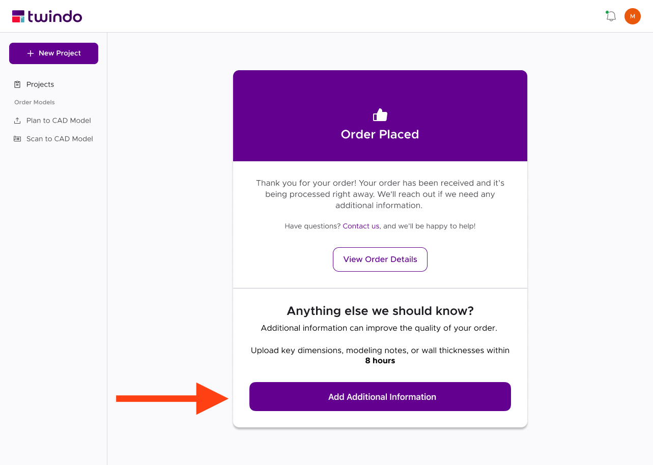 You may submit reference dimensions/materials either in the app or through the web portal using the "Add Additional Information" button which appears after your order has been placed. Wait until your order has fully uploaded, then submit the information as soon as possible: within 8 hours for a standard job or within 2 hours for a rush job.